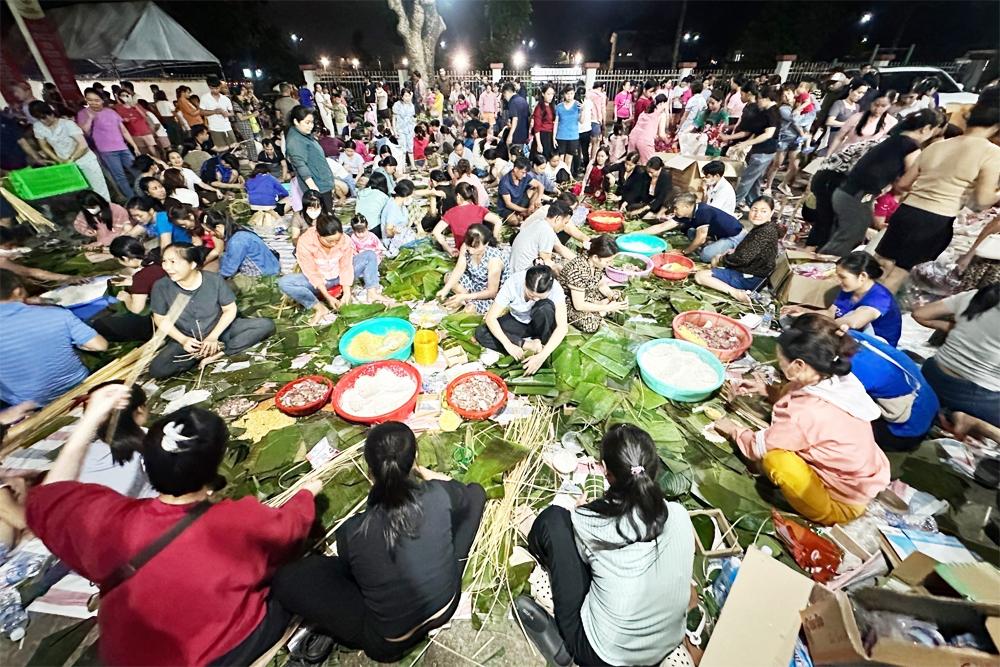 | Hàng trăm người dân gói bánh trong đêm tại phường Trảng Dài, tỉnh Đồng Nai để gửi đến người dân vùng lũ. |