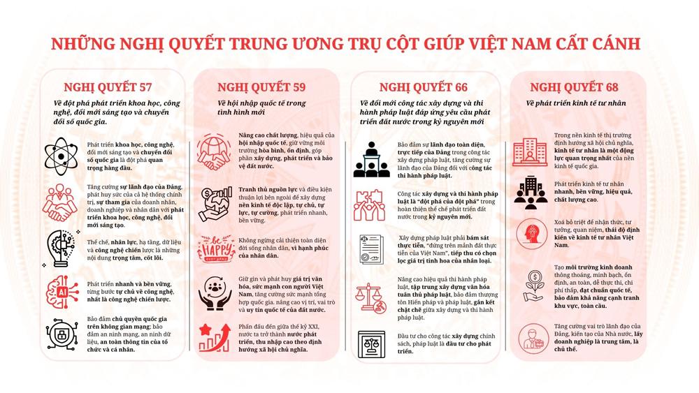Điểm nhấn nổi bật trong năm qua là công tác xây dựng, hoàn thiện thể chế và cuộc cách mạng về sắp xếp, tinh gọn bộ máy, tổ chức chính quyền địa phương hai cấp. Chính phủ đã chỉ đạo xây dựng, phối hợp, tham mưu trình Bộ Chính trị ban hành 10 nghị quyết mang tính đột phá trong các lĩnh vực then chốt.