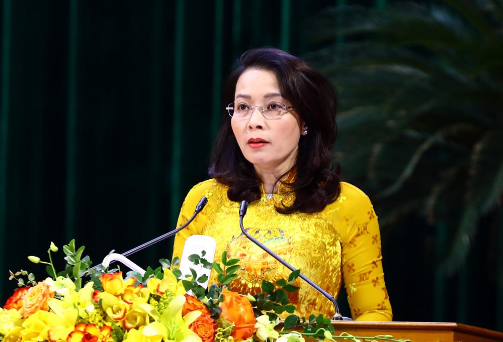 | Đồng chí Nguyễn Thị Hương, Phó Bí thư Thường trực Tỉnh ủy trình bày báo cáo tại hội nghị. |