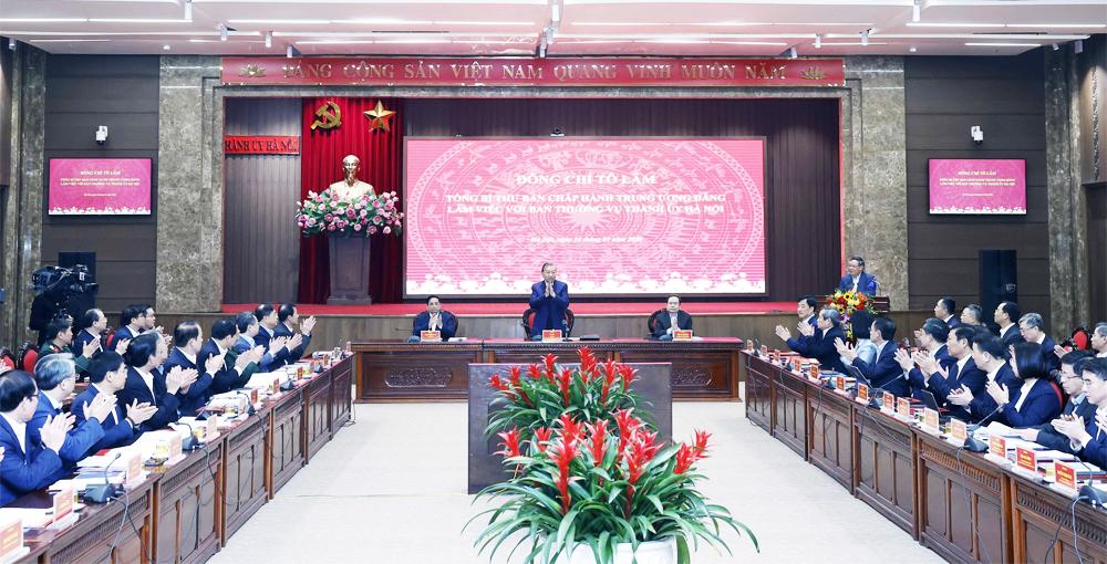 Sau khi nghe phát biểu ý kiến của các lãnh đạo Chính phủ, Quốc hội, lãnh đạo ban, bộ, ngành Trung ương, lãnh đạo thành phố Hà Nội, phát biểu kết luận tại buổi làm việc, Tổng Bí thư Tô Lâm đánh giá cao những kết quả phát triển toàn diện mà Hà Nội đã đạt được trong năm 2025.