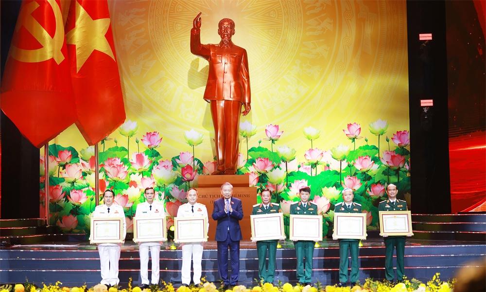 | Tổng Bí thư Tô Lâm trao Danh hiệu Anh hùng Lực lượng vũ trang nhân dân cho các tập thể. |