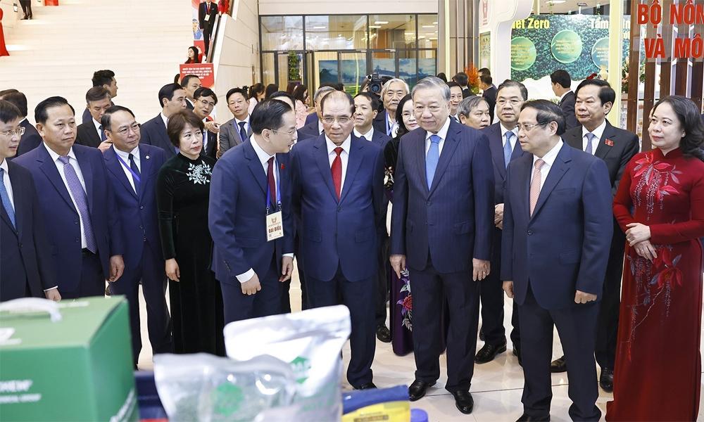 | Tổng Bí thư Tô Lâm và Thủ tướng Phạm Minh Chính cùng các đại biểu tham quan trưng bày các sản phẩm tiêu biểu và thành tựu phát triển trong các lĩnh vực. |