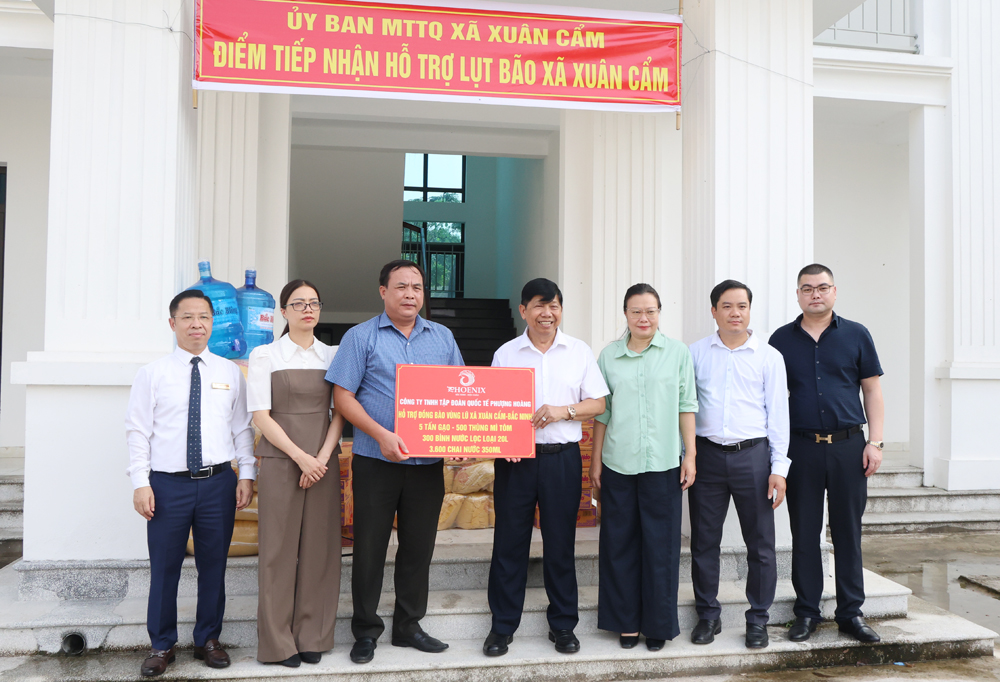 Tại đây, đoàn trao 5 tấn gạo, 500 thùng mỳ ăn liền, 300 bình nước lọc (loại 20 lít), 3,6 nghìn chai nước (loại 350 ml) cho chính quyền địa phương để phân bổ cho người dân bị ảnh hưởng trên địa bàn. Toàn bộ số hàng hóa trên do Công ty trách nhiệm hữu hạn Tập đoàn Quốc tế Phượng Hoàng ủng hộ.