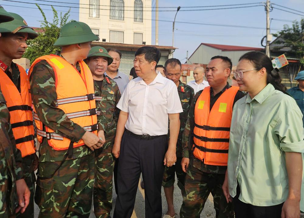 | Đoàn công tác hỏi thăm, động viên lực lượng ứng trực, hỗ trợ Nhân dân khắc phục hậu quả bão lũ. |