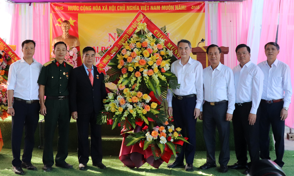 Đồng chí Vũ Minh Hiếu cùng các đại biểu tặng hoa chúc mừng thôn Nhân Lý. |