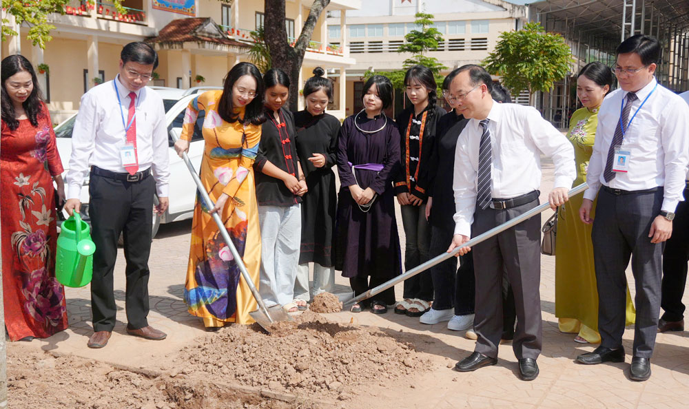 | Đồng chí Trần Văn Tuấn cùng các đại biểu trồng cây lưu niệm tại khuôn viên nhà trường. |