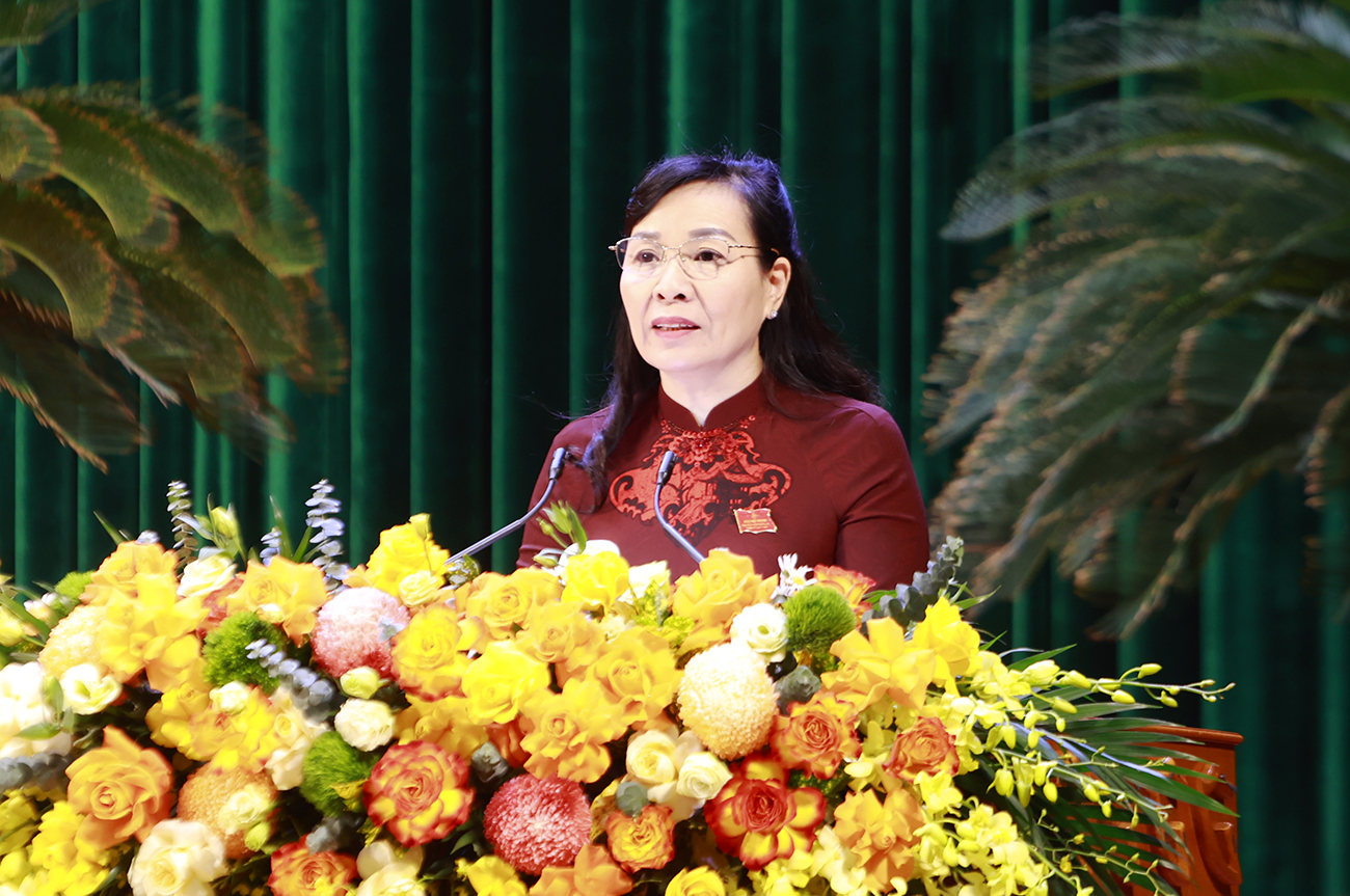 Chủ tịch Ủy ban MTTQ tỉnh Nguyễn Thị Hà trình bày báo cáo của Ủy ban MTTQ tỉnh về việc tham gia xây dựng chính quyền, ý kiến, kiến nghị của cử tri và Nhân dân năm 2025; nhiệm vụ trọng tâm năm 2026.