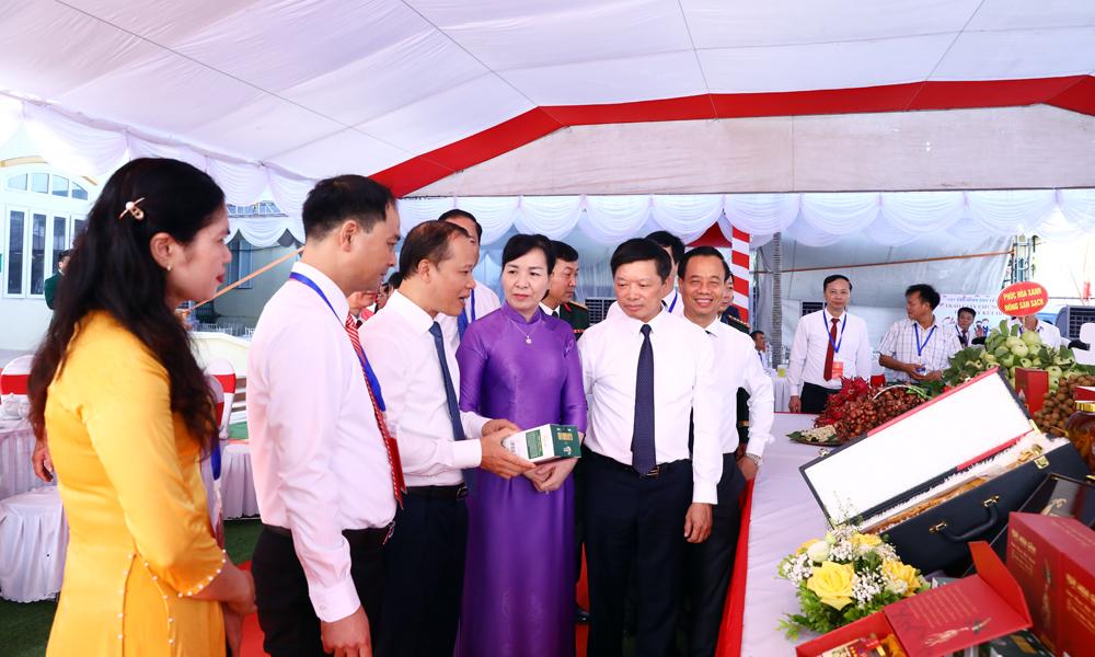 | Các đồng chí lãnh đạo tỉnh và đại biểu thăm gian trưng bày các sản phẩm nông nghiệp đặc trưng của xã Phúc Hòa. |