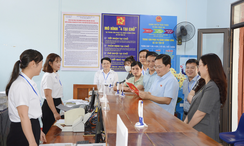 | Đồng chí Nguyễn Anh Tuấn thăm Trung tâm Phục vụ hành chính công xã Tây Yên Tử. |