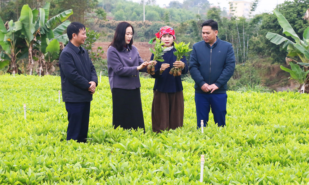 | Lãnh đạo xã Yên Định thăm mô hình sản xuất cây giống lâm nghiệp trên địa bàn thôn Nhân Định. |