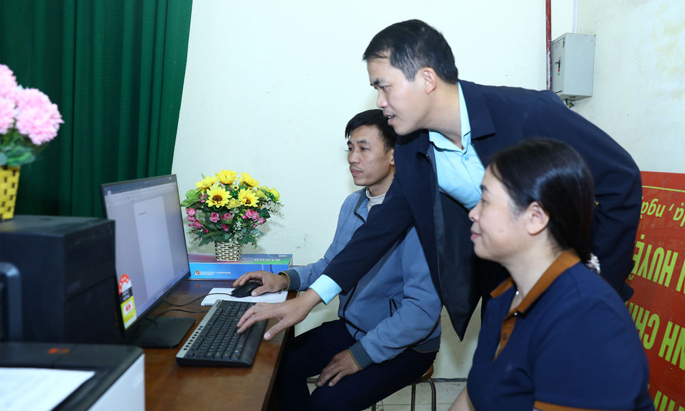 | Lãnh đạo Ban Xây dựng Đảng xã Bố Hạ trực tiếp về hướng dẫn, hỗ trợ cán bộ thôn Đồng Quán sử dụng máy tính, khai thác dữ liệu trên môi trường mạng. |