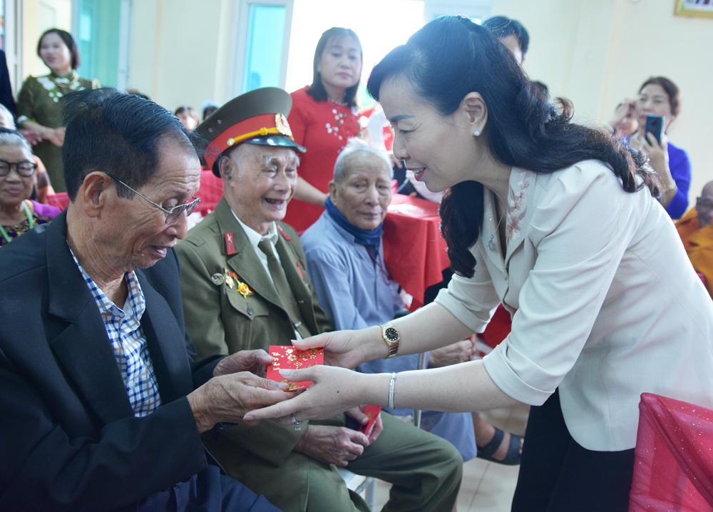 | Đồng chí Nguyễn Thị Hà trao quà cho các cụ cao niên ở thôn Đào Xuyên. |