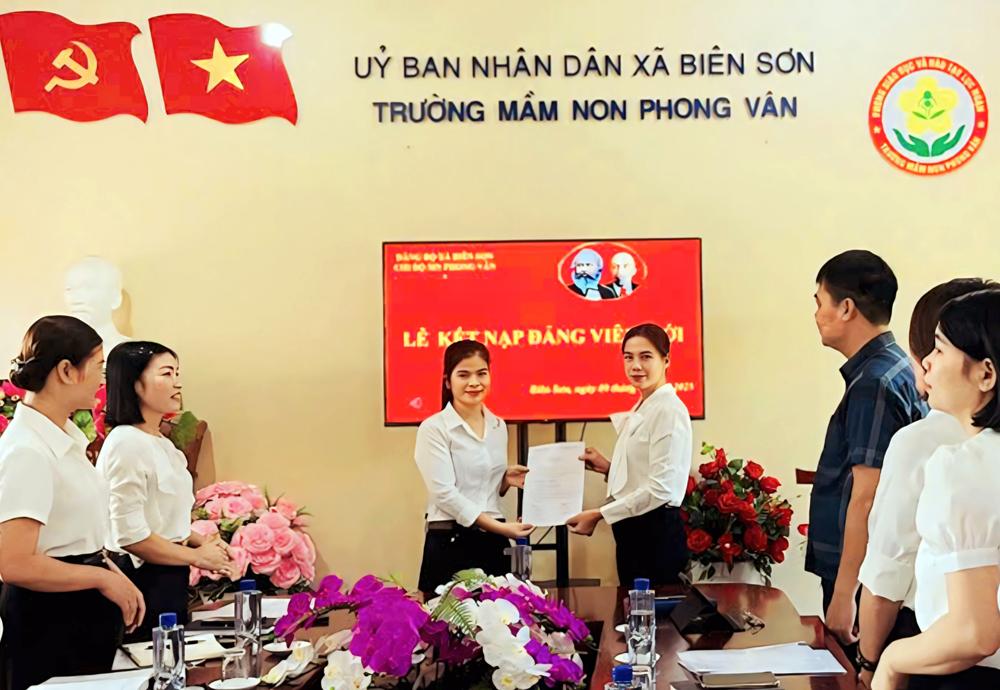 | Đại diện Chi ủy Chi bộ Trường Mầm non Phong Vân trao quyết định kết nạp cho đảng viên mới. |