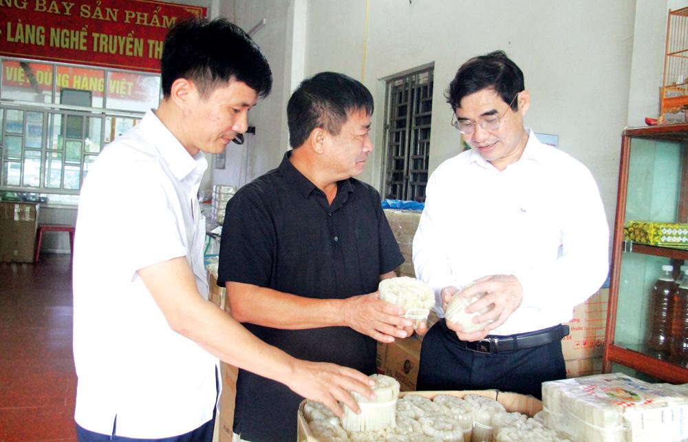 | Lãnh đạo xã Nam Dương nắm bắt tình hình sản xuất, kinh doanh mỳ gạo tại làng nghề Thủ Dương. Ảnh: Sỹ Quyết. |