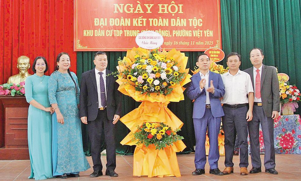 Các đảng viên 213 tặng hoa chúc mừng Ngày hội Đại đoàn kết toàn dân tộc tại tổ dân phố Trung (Bích Động), phường Việt Yên.