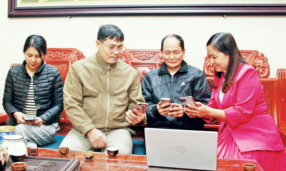 Các đảng viên 213 của Chi bộ tổ dân phố Niềm Xá, phường Kinh Bắc hướng dẫn các đảng viên cao tuổi cập nhật ứng dụng "Sổ tay đảng viên điện tử".