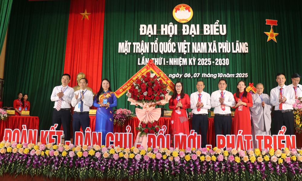 | Lãnh đạo Ủy ban MTTQ tỉnh và lãnh đạo xã Phù Lãng tặng hoa chúc mừng các đại biểu Ủy viên Ủy ban MTTQ xã Phù Lãng nhiệm kỳ 2025-2030. |