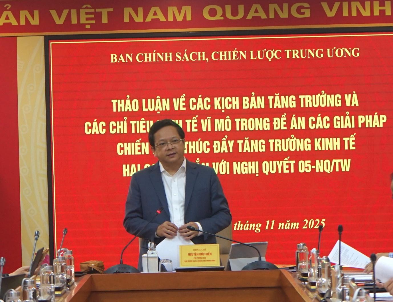 Đồng chí Phó Viện trưởng Đặng Đức Anh giới thiệu khái quát 10 nhóm chỉ tiêu liên quan đến tổng sản phẩm trong nước (GDP) theo tốc độ tăng và cơ cấu giai đoạn 2016 – 2024, ước 2025, xây dựng các kịch bản tăng trưởng giai đoạn 2026-2030 tương ứng với các mục tiêu: 8,1%, 9,2% và 10% theo các trường số liệu: tốc độ, cơ cấu tăng trưởng tổng sản phẩm trong nước, tốc độ và cơ cấu đóng góp của một số ngành kinh tế quan trọng, vốn đầu tư, xuất - nhập khẩu,..