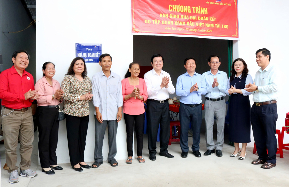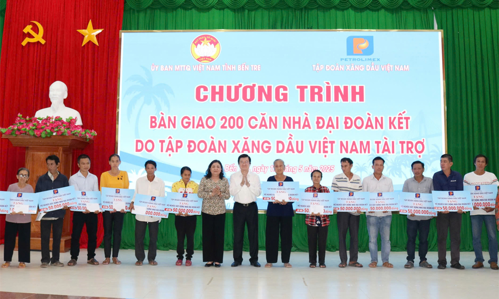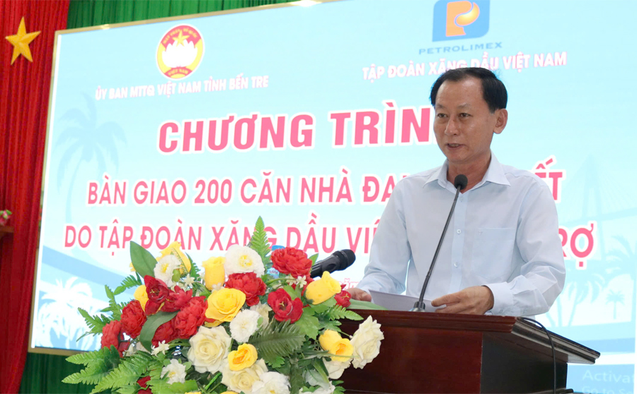 Phó Chủ tịch UBND tỉnh Nguyễn Minh Cảnh cho biết: Năm 2024, 2025 trên địa bàn tỉnh Bến Tre có 2.100 hộ nghèo khó khăn về nhà ở. Với sự nỗ lực phấn đấu của cả hệ thống chính trị và Nhân dân trong tỉnh, cùng với sự hỗ trợ của Chính phủ, các tổ chức cá nhân trong và ngoài tỉnh, đến nay Bến Tre đã xây dựng được 1.100 căn nhà đại đoàn kết cho hộ nghèo, trong đó có 200 căn nhà đại đoàn kết do Nguyên Chủ tịch nước Trương Tấn Sang vận động Tập đoàn Xăng dầu Việt Nam hỗ trợ và được bàn giao hôm nay. Thông qua hoạt động ý nghĩa này đã giúp bà con có một mái nhà vững chắc, che nắng, che mưa, tiếp sức cho gia đình khó khăn có thêm động lực, tăng gia sản xuất và ổn định cuộc sống.