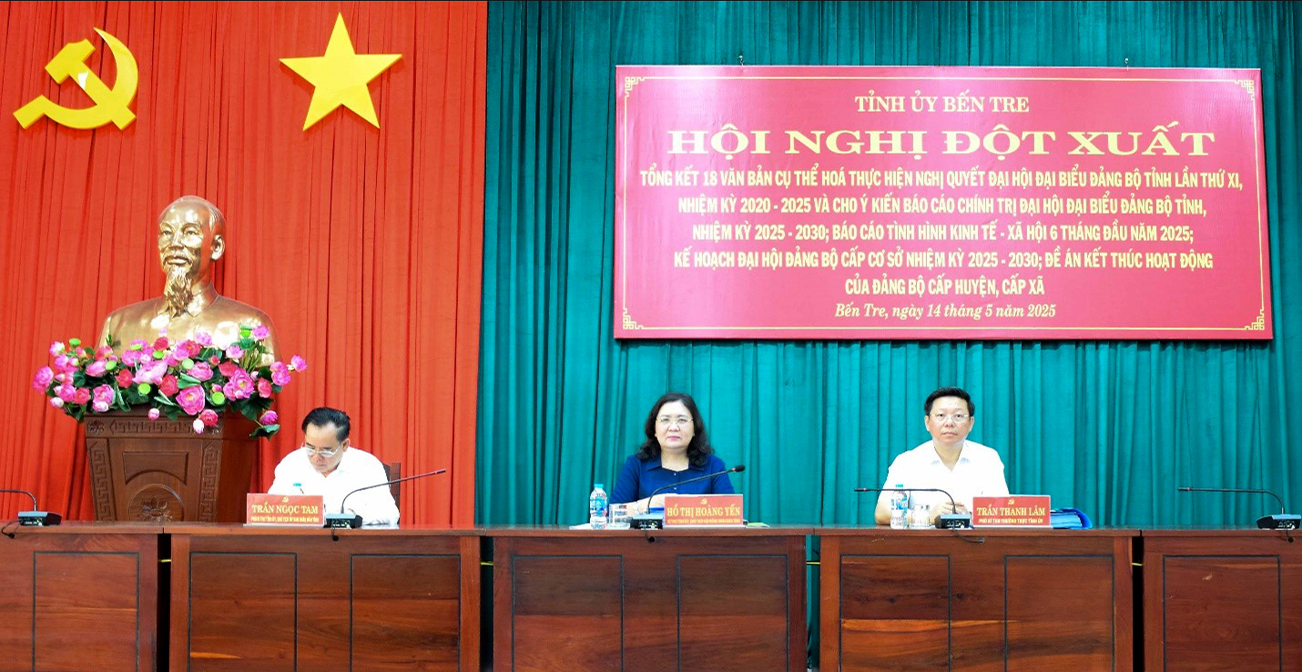 Ngày 14/5/2025, Ban Chấp hành Đảng bộ tỉnh khóa XI tổ chức Hội nghị đột xuất để thảo luận, cho ý kiến các nội dung: (1) Dự thảo các báo cáo tổng kết văn bản cụ thể hoá Nghị quyết Đại hội đại biểu Đảng bộ tỉnh lần thứ XI, nhiệm kỳ 2020-2025; (2) dự thảo Báo cáo chính trị Văn kiện Đại hội đại biểu Đảng bộ tỉnh, nhiệm kỳ 2025-2030; (3) dự thảo Báo cáo tình hình kinh tế - xã hội 6 tháng đầu năm 2025; (4) dự thảo Kế hoạch đại hội đảng bộ cấp cơ sở và cấp trên cơ sở nhiệm kỳ 2025-2030; (5) dự thảo Đề án kết thúc hoạt động của đảng bộ cấp huyện, cấp xã; thành lập các đảng bộ cấp xã mới trực thuộc Tỉnh ủy và số lượng ban chấp hành đảng bộ xã, phường sau hợp nhất, sáp nhập.