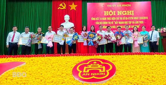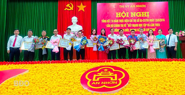 Thị ủy An Nhơn tặng giấy khen cho các tập thể, cá nhân có thành tích xuất sắc qua 10 năm thực hiện Chỉ thị số 05-CT/TW ngày 15.5.2016 của Bộ Chính trị về “Đẩy mạnh học tập và làm theo tư tưởng, đạo đức, phong cách Hồ Chí Minh. Ảnh: LÊ NGÂN