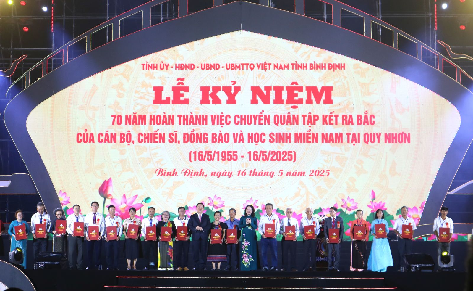 Về phía lãnh đạo tỉnh Bình Định có các đồng chí: Hồ Quốc Dũng - Ủy viên Ban Chấp hành Trung ương Đảng, Bí thư Tỉnh ủy, Chủ tịch HĐND tỉnh; các đồng chí Phó Bí thư Tỉnh uỷ, Ủy viên Ban Thường vụ Tỉnh uỷ, lãnh đạo HĐND, UBND, Ủy ban Mặt trận Tổ quốc Việt Nam tỉnh; các đồng chí nguyên lãnh đạo tỉnh qua các thời kỳ; các Mẹ Việt Nam anh hùng, Anh hùng Lực lượng vũ trang Nhân dân; lãnh đạo các ban, sở, ngành, hội, đoàn thể của tỉnh; lãnh đạo các cơ quan Trung ương trên địa bàn tỉnh; lãnh đạo các huyện, thị xã, thành phố; cán bộ, chiến sĩ, đồng bào và học sinh miền Nam tập kết ra Bắc tại Quy Nhơn.