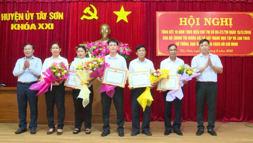 Theo báo cáo, qua 10 năm triển khai thực hiện Chỉ thị số 05-CT/TW, Huyện ủy Tây Sơn đã xây dựng, ban hành 48 văn bản để lãnh đạo, chỉ đạo hệ thống chính trị và các tổ chức cơ sở đảng trong toàn huyện; các tổ chức cơ sở đảng xây dựng và ban hành 667 văn bản để triển khai thực hiện gắn với việc thực hiện nhiệm vụ chính trị, phù hợp với điều kiện và đặc điểm của địa phương, cơ quan, đơn vị. Toàn huyện đã tổ chức 326 hội nghị học tập, nghiên cứu, quán triệt Chỉ thị số 05-CT/TW, Kết luận số 01-KL/TW và các chuyên đề học tập và làm theo tư tưởng, đạo đức, phong cách Hồ Chí Minh hàng năm, toàn khóa cho 47.748 lượt cán bộ, đảng viên. Hằng năm, 100% tổ chức đảng xây dựng kế hoạch và hơn 95% cán bộ, đảng viên, công chức, viên chức người lao động trong các cơ quan, đơn vị xây dựng cam kết tu dưỡng rèn luyện. Hoạt động tuyên truyền trực quan từ huyện đến cơ sở được ngành chức năng và các chi, đảng bộ chú trọng thực hiện: Chiếu 136 bộ phim, video; tuyên truyền trực quan 1.735 pa nô, 847 băng rôn, 128 khẩu hiệu, 187 sự kiện, chương trình (trong đó có 91 hoạt động thể dục thể thao, 39 chương trình văn nghệ; tổ chức 57 hội thi "Kể chuyện Bác Hồ") .... Công tác biểu dương, khen thưởng, tôn vinh các tập thể, cá nhân có thành tích xuất sắc trong học tập và làm theo tư tưởng, đạo đức, phong cách Hồ Chí Minh được các cấp, các địa phương, cơ quan, đơn vị trong huyện quan tâm thực hiện; Ủy ban nhân dân huyện khen thưởng 35 tập thể và 58 cá nhân; chính quyền cơ sở khen thưởng cho 136 tập thể và 249 cá nhân tiêu biểu. Qua thực hiện đã xuất hiện nhiều cách làm hay, sáng tạo, có sức lan tỏa, từ đó, làm chuyển biến mạnh mẽ về nhận thức và hành động, tác phong, thái độ, trách nhiệm và văn hóa ứng xử của đảng viên, cán bộ trong thực hiện nhiệm vụ chính trị, đề ra những giải pháp thiết thực, giải quyết được nhiều vấn đề nổi cộm, bức xúc, tồn đọng nhiều năm như: Công tác bồi thường, giải phóng mặt bằng; công tác quản lý đất đai, bảo vệ tài nguyên, khoáng sản và môi trường; cải cách thủ tục hành chính; xóa bỏ lò gạch thủ công, ...góp phần đưa việc học tập và làm theo tư tưởng, đạo đức, phong cách Hồ Chí Minh đi vào cuộc sống.
