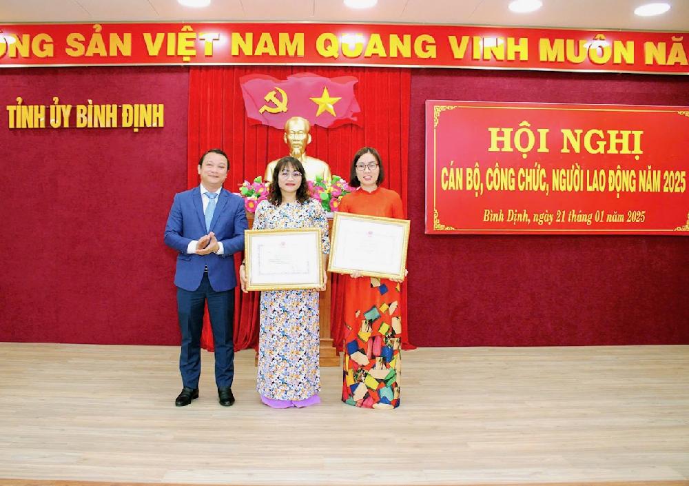 Nhân dịp này, Hội nghị đã biểu dương, khen thưởng các tập thể, cá nhân đã hoàn thành xuất sắc nhiệm vụ công tác năm 2024: Trao tặng Bằng khen của Chủ tịch Ủy ban nhân dân tỉnh cho 02 cá nhân; Chánh Văn phòng Tỉnh ủy đã trao tặng Danh hiệu chiến sĩ thi đua cấp cơ sở cho 17 cá nhân và Giấy khen cho 03 tập thể phòng: Tổng hợp; Hành chính, Lưu trữ; Quản trị và 20 cá nhân; trao tặng Giấy khen của Công đoàn Viên chức tỉnh cho 04 cá nhân đã có thành tích xuất sắc trong hoạt động công đoàn.