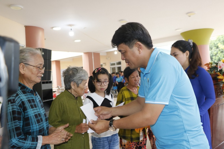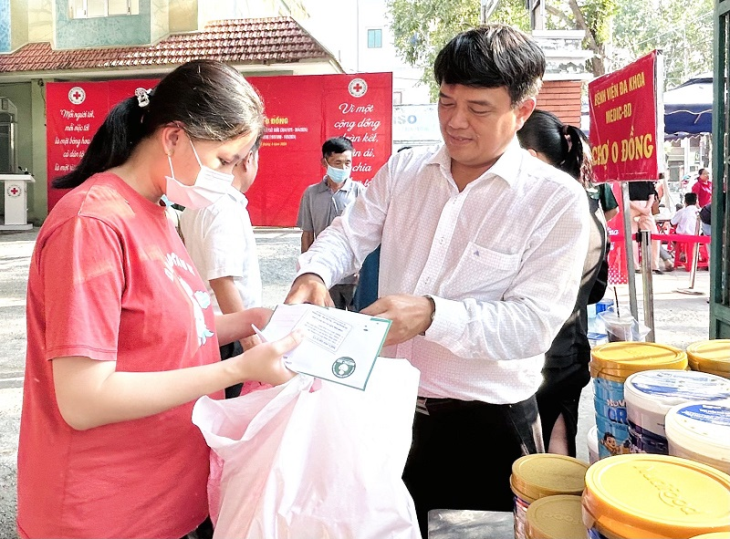 Đồng chí Bùi Thanh Nhân, UVTV, Trưởng Ban Dân vận Tỉnh ủy tặng quà cho người dân có hoàn cảnh khó khăn và cùng các chức sắc tham gia hoạt động thực hiện "Ngày thứ bảy văn minh"