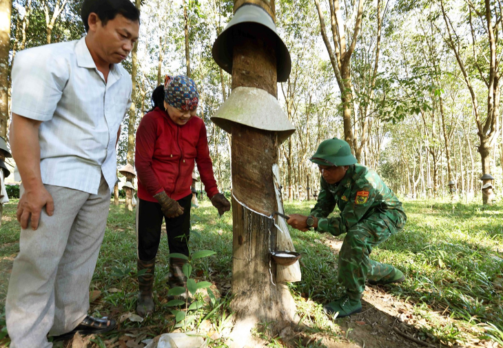 Cán bộ, chiến sĩ Đồn Biên phòng Đắc Xú hướng dẫn cách cạo mủ cao su cho đồng bào thôn Kei Joi, xã Đắc Xú, huyện Ngọc Hồi, tỉnh Kon Tum_Ảnh: TTXVN