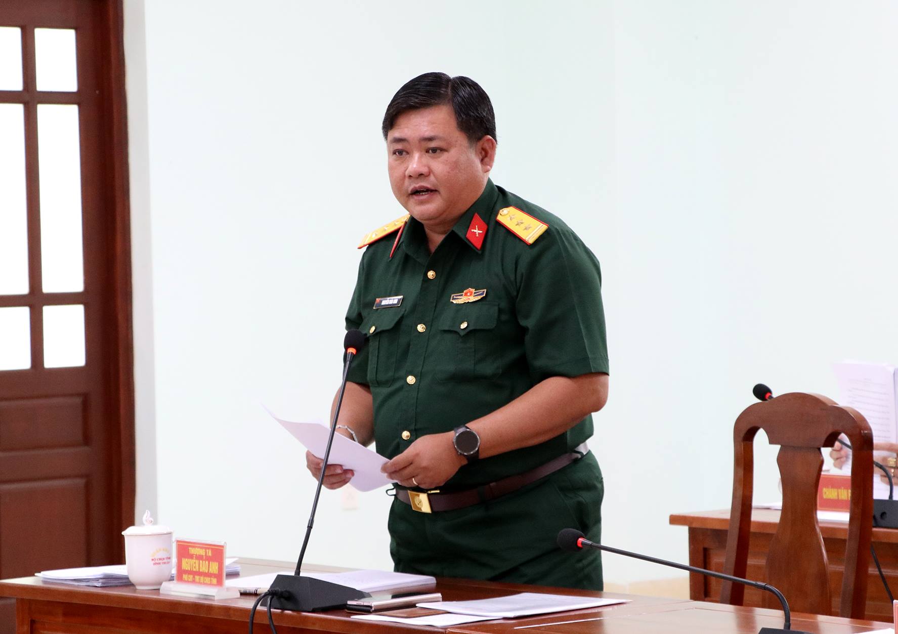 Thượng tá Nguyễn Bảo Anh - Phó Chỉ huy trưởng, Tham mưu trưởng Bộ CHQS tỉnh báo cáo tại buổi làm việc