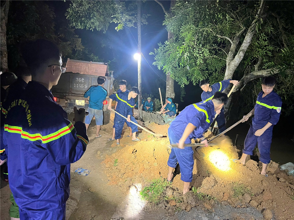 Trước tình hình khẩn cấp, ngay sau khi nhận được tin báo, Phòng PCCC và CNCH Công an tỉnh đã nhanh chóng huy động 27 cán bộ, chiến sĩ từ các Đội Chữa cháy và CNCH khu vực 1, khu vực 5 cùng các phương tiện, thiết bị chuyên dụng lập tức có mặt tại hiện trường, phối hợp cùng chính quyền địa phương, Công an xã, lực lượng tham gia bảo vệ an ninh, trật tự ở cơ sở và quần chúng nhân dân triển khai các biện pháp ứng cứu, gia cố, bảo vệ an toàn cho tuyến đê đang có nguy cơ sạt lở nghiêm trọng. Đồng thời, bố trí lực lượng, phương tiện sẵn sàng ứng phó với mọi tình huống có thể xảy ra.