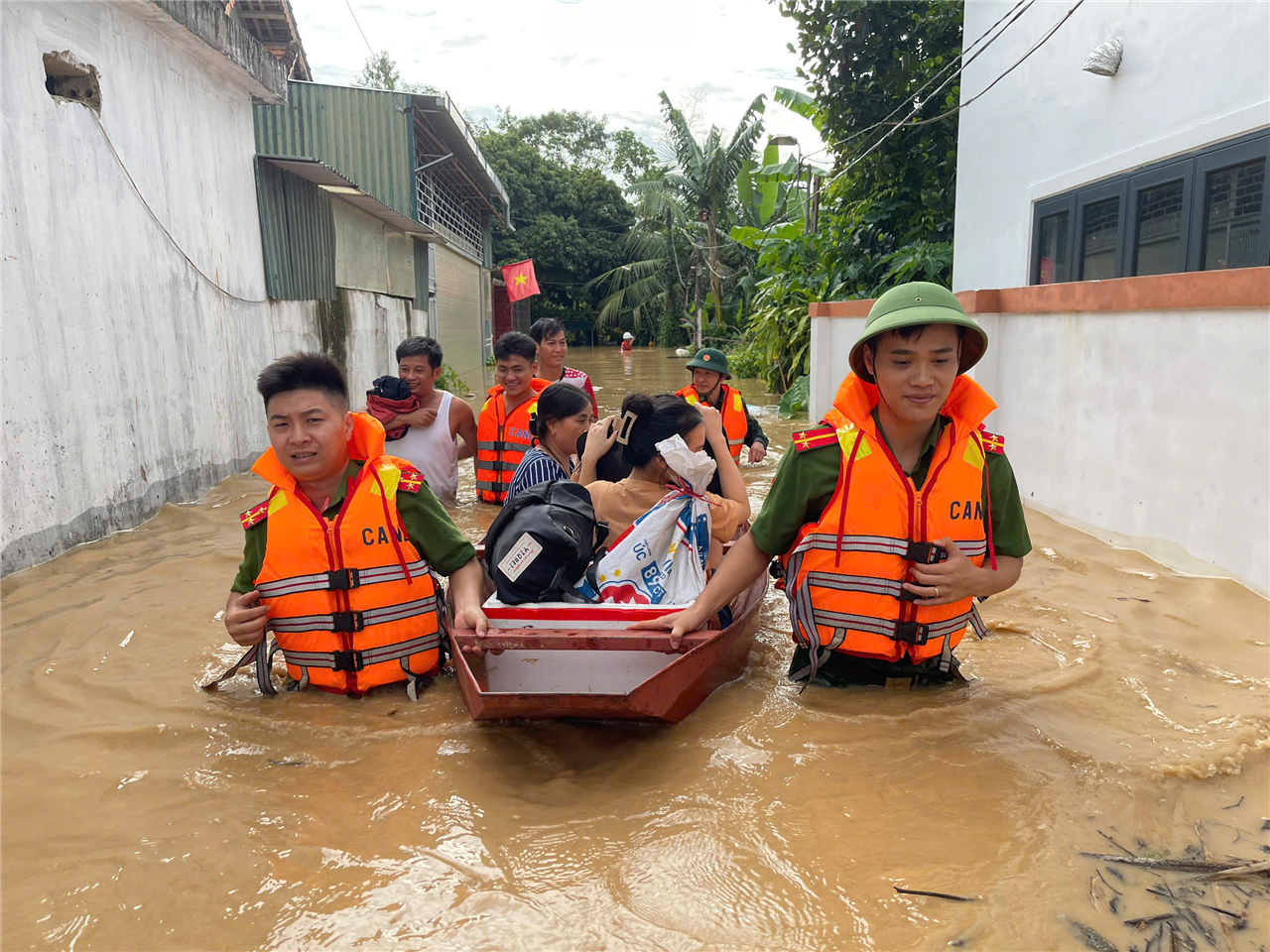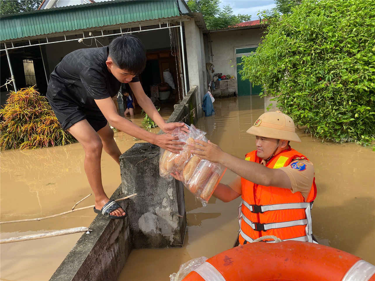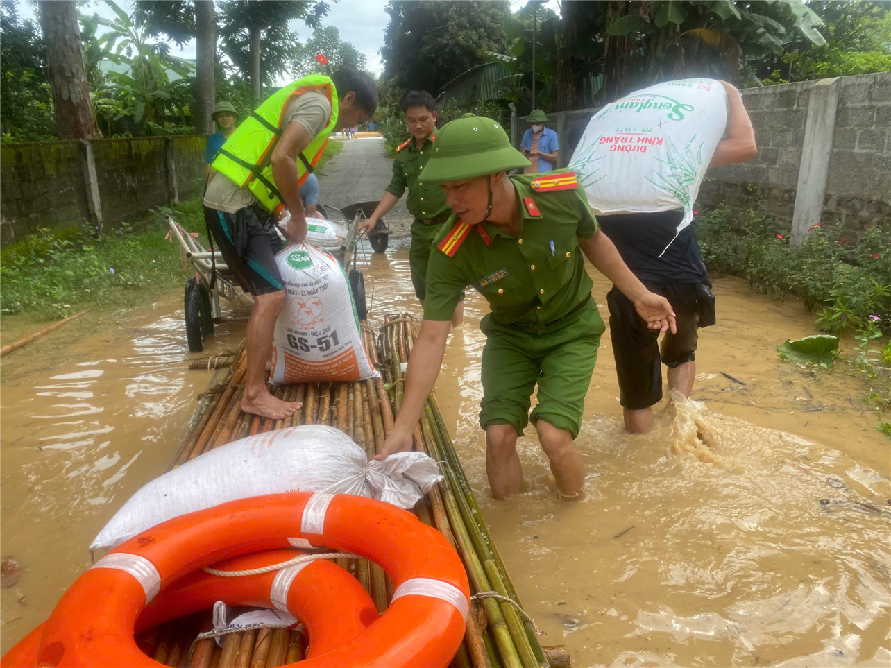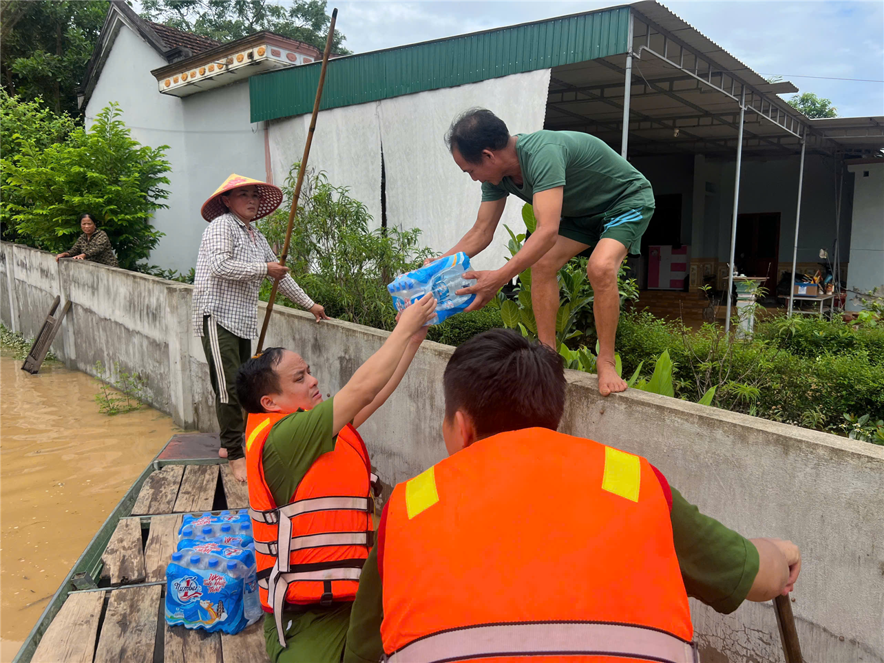 |  |  | | Tổ công tác Công an tỉnh phối hợp với Công an xã Nhân Hòa sử dụng thuyền, phao tiếp cận các vùng bị chia cắt để tiếp tế nhu yếu phẩm cho bà con. | | | |