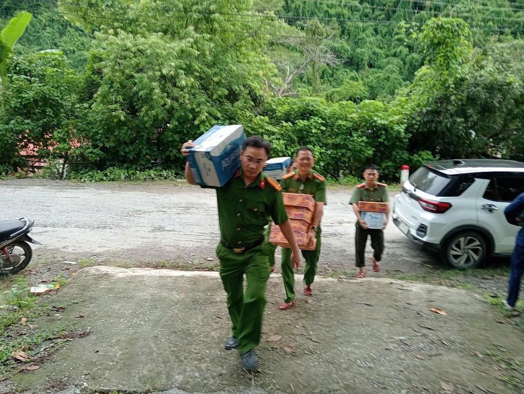 | Công an xã Yên Na tiếp ứng nhu yếu phẩm cho bà con nhân dân vùng bị cô lập. |