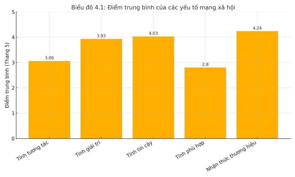 Tính tương tác đạt mức trung bình 3.06, cho thấy vai trò vừa phải trong việc hỗ trợ xây dựng nhận thức thương hiệu. Trong khi đó, tính phù hợp có điểm thấp nhất (2.80), phản ánh việc các nội dung trên mạng xã hội đôi khi chưa thực sự sát với nhu cầu và sở thích cụ thể của người tiêu dùng. Biểu đồ 1 đã minh họa điểm trung bình của các yếu tố được khảo sát.