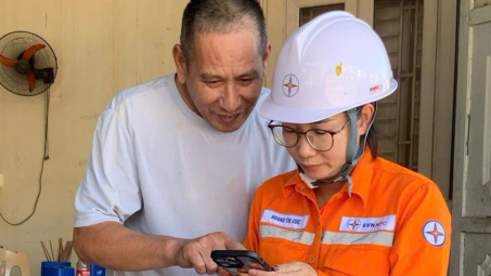 Công nhân Đội Quản lý Điện lực khu vực Uông Bí hướng dẫn khách hàng thanh toán tiền điện không dùng tiền mặt qua App chăm sóc khách hàng EVNNPC