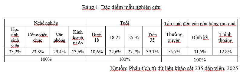 Nghiên cứu được thực hiện thông qua 2 bước là nghiên cứu sơ bộ (nghiên cứu định tính) và nghiên cứu chính thức (Nghiên cứu định lượng). Trong đó, nghiên cứu định tính lược khảo nghiên cứu trước nhằm khám phá lý thuyết, xây dựng mô hình nghiên cứu và điều chỉnh thang đo phù hợp đối tượng nghiên cứu. Nghiên cứu định lượng được thực hiện trên 235 đối tượng khảo sát là người tiêu dùng đã từng tham gia mua sắm tại các siêu thị có bán lẻ sản phẩm rau quả trên địa bàn thành phố Long Xuyên như Bách Hóa Xanh, Vinmart, Co.op Mark và Mega Market. Nghiên cứu sử dụng phương pháp lấy mẫu thuận tiện bằng bản hỏi trực tiếp và bản hỏi trực tuyến trên ứng dụng google form. Trước khi tiến hành phân tích hồi quy để xem xét mức độ ảnh hưởng của các ba nhân tố cốt lõi trong CSR và mức độ ảnh hưởng của CSR đối với lòng trung thành của khách hàng, dữ liệu được mã hóa, làm sạch (thông qua phần mềm SPSS20) và thực hiện lần lượt các phân tích gồm: Đánh giá độ tin cậy của thang đo bằng hệ số Cronbach’s Alpha; Phân tích nhân tố khám phá EFA và Kiểm định mô hình hồi quy tuyến tính bội. Thang đo được đo lường ở dạng thang đo Likert 5 mức độ. Thống kê mô tả mẫu ngoài tỉ lệ nữ là 80,4%, nam là 19,6% thì các đặc điểm khác được trình bày trong Bảng 1.