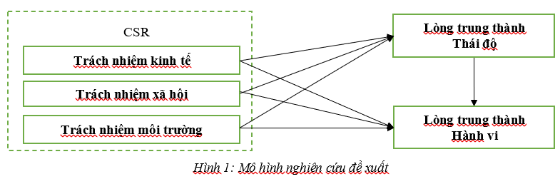 (iii) Mối quan hệ giữa lòng trung thành và CSR: theo Nguyễn Mạnh Quân (2015), khách hàng tiêu dùng sản phẩm của doanh nghiệp không chỉ bởi sản phẩm đáp ứng tối đa nhu cầu về chất lượng giá, được đối xử công bằng dù ở tầng lớp xã hội ra sao mà còn bởi lẽ khách hàng nhận thức rằng khi tiêu dùng sản phẩm được sản xuất từ nguồn nguyên liệu thân thiện môi trường, hạn chế sử dụng tài nguyên có nghĩa họ đang góp phần nhỏ bé của bản thân, chung tay với doanh nghiệp và cộng đồng tạo lên không gian sống bền vững cho các thế hệ tương lai. Sharah Duncan (2022) cũng đề cập đến xu hướng thế hệ trẻ những người tiêu dùng có ý thức khi họ chủ trương ủng hộ phương thức chế tạo sản phẩm thân thiện hệ sinh thái, duy trì sản lượng sản xuất vừa đủ, những người tiêu dùng có ý thức này muốn dùng các hành động cá nhân của mình để tạo ra sức tác động trên toàn cầu. Đã có nhiều nghiên cứu thực nghiệm trong và ngoài nước chứng minh mối quan hệ có ý nghĩa thống kê giữa CSR và lòng trung thành của khách hàng, gồm: Bùi Nhất Vương và cộng sự (2023), Nguyễn Hoàng Khởi và Bùi Hải Văn (2018), Nguyễn Văn Anh và Nguyễn Thị Phương Thảo (2021), Hoàng Anh Thư (2023), Đinh Văn Hoàng (2022), Efstathios Dimitriadis và Eleni Zilakaki (2019), Mai Ngọc Khương và cộng sự (2022), Muzammal llyas Sindhu và Muhamad Arif (2017)… Từ những biện luận và lược khảo nghiên cứu trước như trên, tác giả đề xuất mô hình nghiên cứu như sau: (Hình 1)