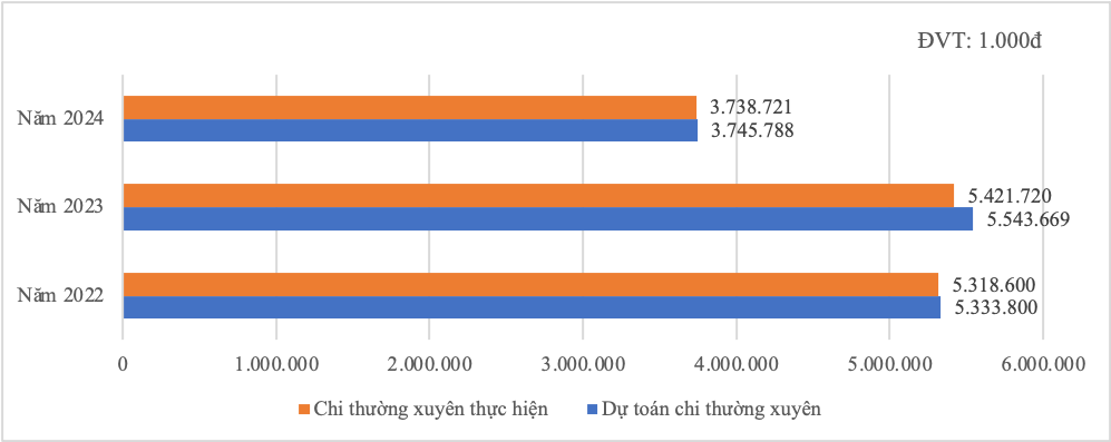Kết quả ở Hình 1 cho thấy, trong giai đoạn 2022 - 2024, với mục tiêu quản lý chặt chẽ các khoản chi nói chung và chi thường xuyên nói riêng nên việc chấp hành dự toán chi thường xuyên về tổng thể cơ bản đã đảm bảo, không vượt quá dự toán đã lập.