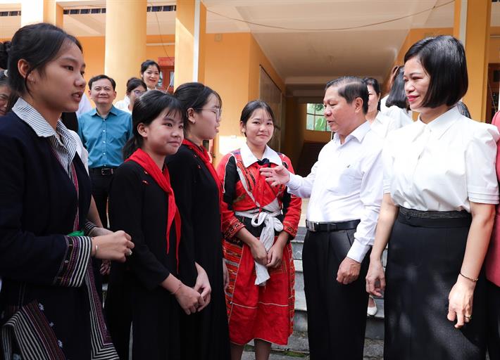 Thứ trưởng Lê Tấn Dũng trò chuyện, chia sẻ cùng học sinh Trường Phổ thông Dân tộc Nội trú THCS&THPT Chiêm Hóa.