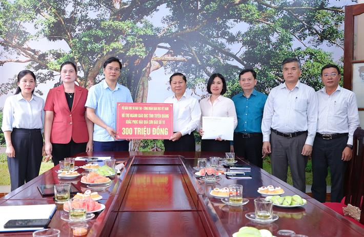 Nhân dịp này, Bộ GDĐT, Công đoàn Giáo dục Việt Nam trao tặng Sở GDĐT tỉnh Tuyên Quang 300 triệu đồng để giúp các trường sớm ổn định hoạt động dạy học; Nhà xuất bản Giáo dục Việt Nam trao tặng sách giáo khoa trị giá 100 triệu đồng, phục vụ nhu cầu học tập thiết yếu của học sinh vùng bị ảnh hưởng.Top of FormBottom of Form