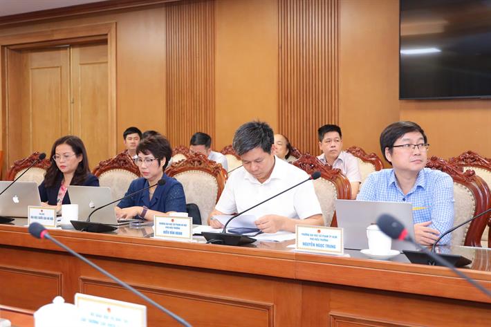 Cục trưởng Cục Khoa học, Công nghệ và Thông tin Phạm Quang Hưng trao đổi tại phiên họp