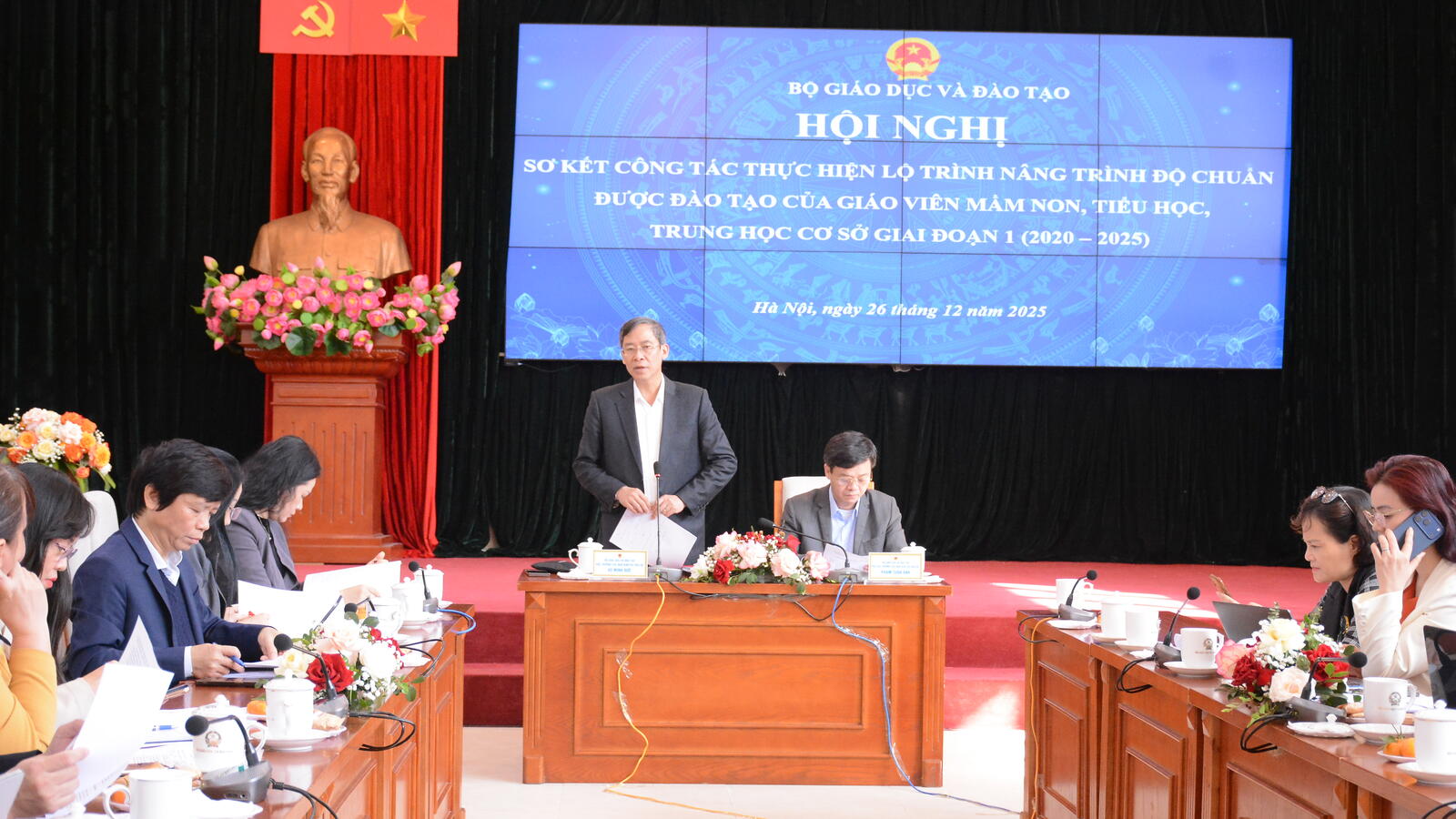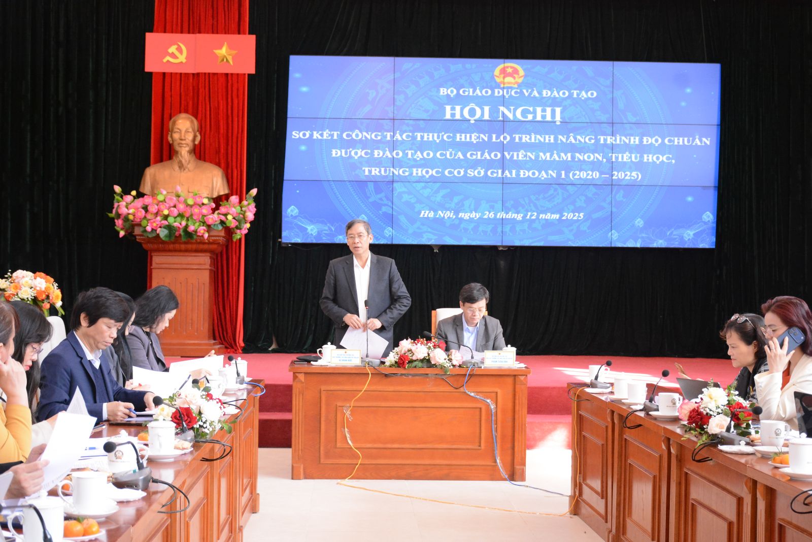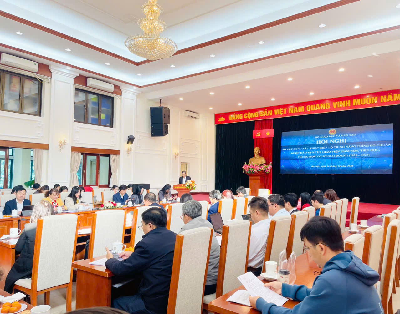 Báo cáo tại hội nghị các kết quả thực hiện lộ trình ở giai đoạn 1, Cục trưởng Cục Nhà giáo và Cán bộ quản lí giáo dục Vũ Minh Đức cho biết: thực hiện Luật Giáo dục số 43/2019/QH14, Bộ GDĐT đã tham mưu, trình Chính phủ ban hành Nghị định số 71/2020/NĐ-CP ngày 30/6/2020 quy định lộ trình thực hiện nâng trình độ chuẩn được đào tạo của giáo viên mầm non, tiểu học, trung học cơ sở (THCS).