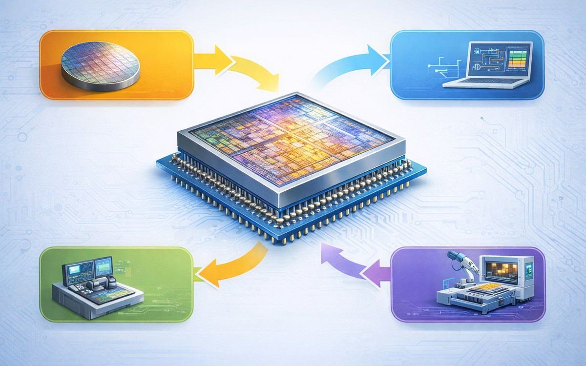 Sản xuất, đóng gói và kiểm thử chip: bao gồm thiết bị cho toàn bộ chuỗi công đoạn như lò tăng trưởng đơn tinh thể, thiết bị gia công tinh thể để tạo wafer, thiết bị cấy ion, thiết bị quang khắc, thiết bị lắng đọng màng mỏng (như MBE/ALD/CVD/PVD…), thiết bị khắc (dry/wet etch), thiết bị làm sạch wafer, thiết bị xử lý lớp cản quang, thiết bị liên kết và cân chỉnh wafer, hệ thống xử lý vật liệu tự động, thiết bị giám sát quy trình, thiết bị cắt tách khuôn (dicing), thiết bị lắp ráp tích hợp và thiết bị kiểm thử (wafer sort/final test).