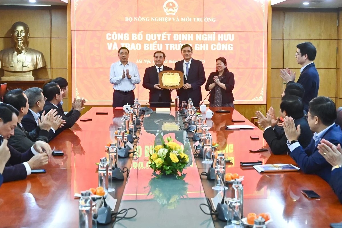 Lãnh đạo Bộ Nông nghiệp và Môi trường tại Lễ Công bố quyết định nghỉ hưu và trao biểu trưng ghi công. Ảnh: Tùng Đinh.