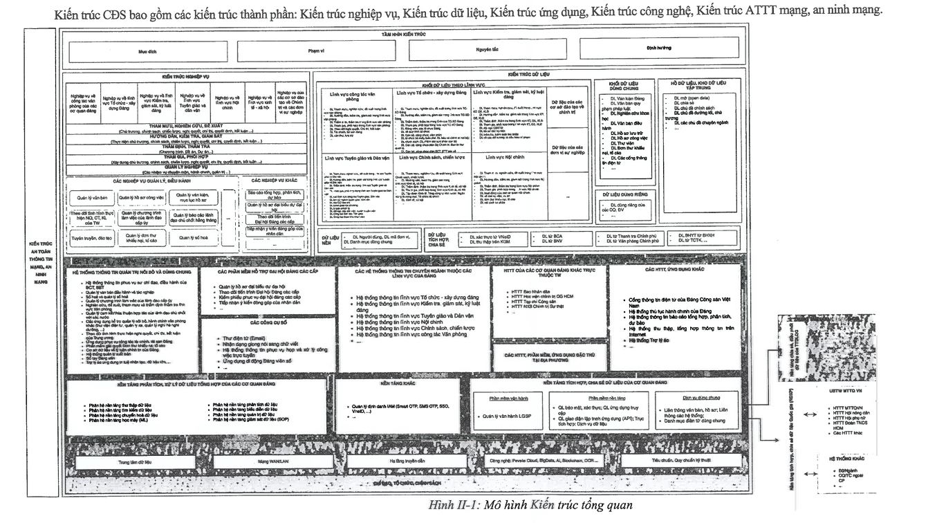 Trong đó nhấn mạnh với tầm quan trọng của triển khai Kiến trúc CĐS, bao gồm kiến trúc nghiệp vụ, kiến trúc dữ liệu, kiến trúc ứng dụng, kiến trúc công nghệ, kiến trúc ATTT; đặc biệt là liên thông, chia sẻ dữ liệu theo thẩm quyền sử dụng trong toàn hệ thống, tránh độc quyền, cát cứ thông tin, dữ liệu; Ban Bí thư giao Ban Chỉ đạo Chuyển đổi số các cơ quan đảng giúp Ban Bí thư chỉ đạo triển khai Kiến trúc này.