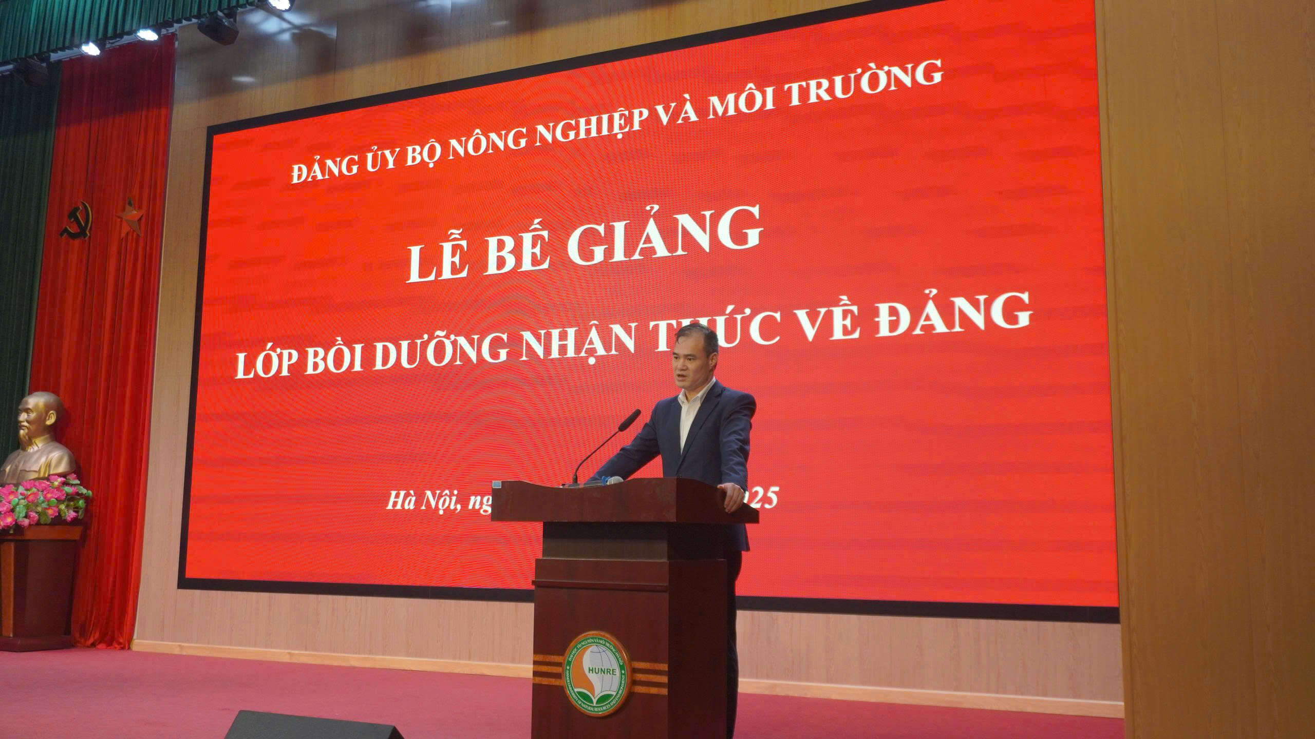 Phát biểu tại lễ bế giảng, đồng chí Phan Thành Công, Ủy viên Ban Chấp hành, Phó trưởng Ban Tuyên giáo và Dân vận Đảng ủy Bộ biểu dương tinh thần học tập nghiêm túc, ý thức rèn luyện của học viên; đồng thời nhấn mạnh ý nghĩa đặc biệt của ngày hôm nay 07/11 – kỷ niệm 108 năm Cách mạng Tháng Mười Nga (1917 - 2025), sự kiện lịch sử trọng đại mở ra thời đại mới cho nhân loại, khẳng định sức sống bền vững của lý tưởng cách mạng vô sản và con đường đi lên chủ nghĩa xã hội mà nhân dân ta đã lựa chọn. Đồng chí bày tỏ sự trân trọng đối với tinh thần phối hợp chủ động, trách nhiệm của Trường Đại học Tài nguyên và Môi trường Hà Nội trong việc chuẩn bị cơ sở vật chất, tổ chức giảng dạy và quản lý lớp học. Đồng thời nhấn mạnh, Nhà trường đã có nhiều nỗ lực trong công tác phát hiện, bồi dưỡng và giới thiệu quần chúng ưu tú cho Đảng, qua đó đóng góp tích cực vào công tác phát triển đảng viên mới của Đảng bộ Bộ Nông nghiệp và Môi trường.