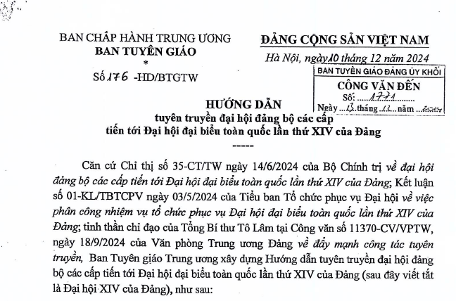 Hướng dẫn số 176-HD/BTGTW ngày 17/12/2024 của Ban Tuyên giáo Trung ương về hướng dẫn tuyên truyền đại hội đảng bộ các cấp tiến tới Đại hội đại biểu toàn quốc lần thứ XIV của Đảng