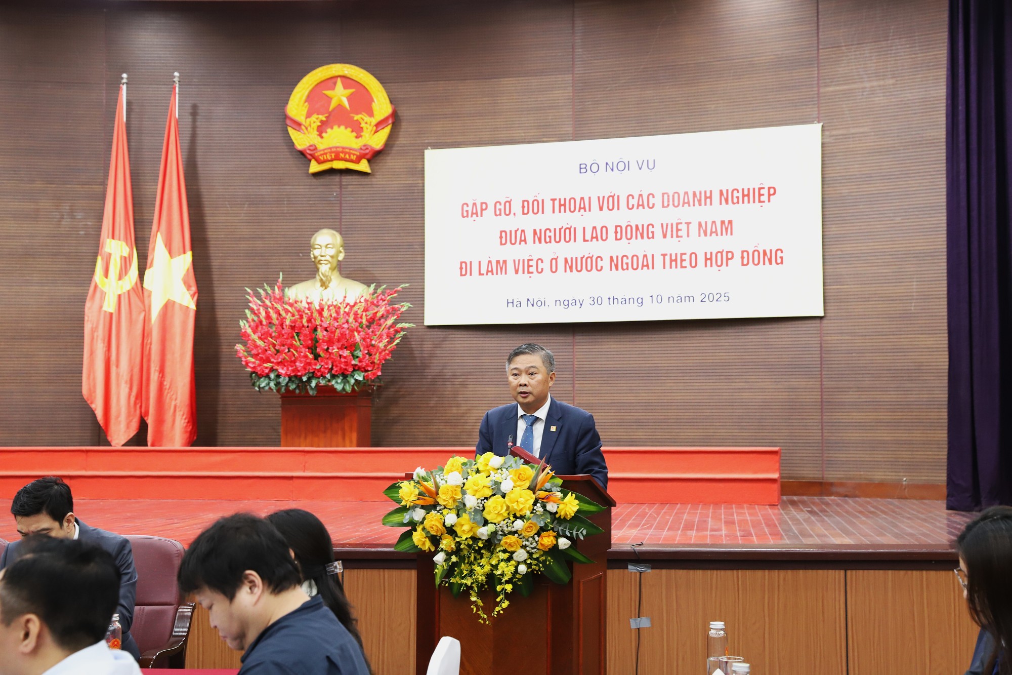 Sáng ngày 30/10/2025, tại Hà Nội, Bộ Nội vụ đã tổ chức Hội nghị gặp gỡ, đối thoại với các doanh nghiệp đưa người lao động Việt Nam đi làm việc ở nước ngoài theo hợp đồng. Thứ trưởng Bộ Nội vụ Vũ Chiến Thắng chủ trì hội nghị.