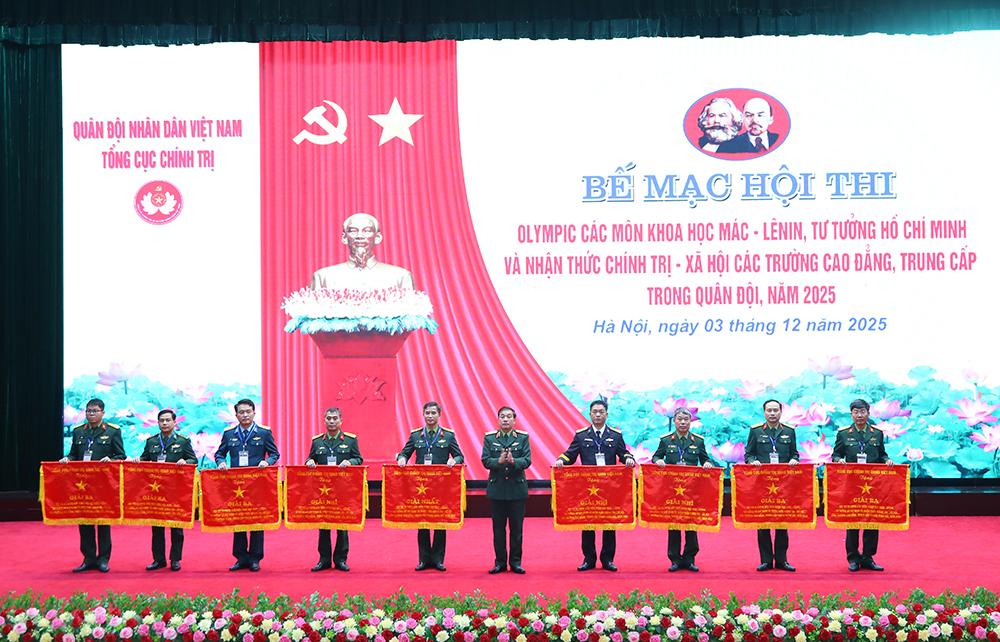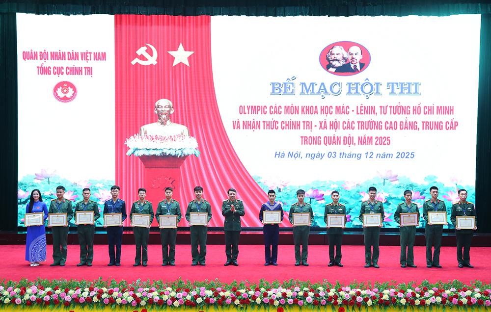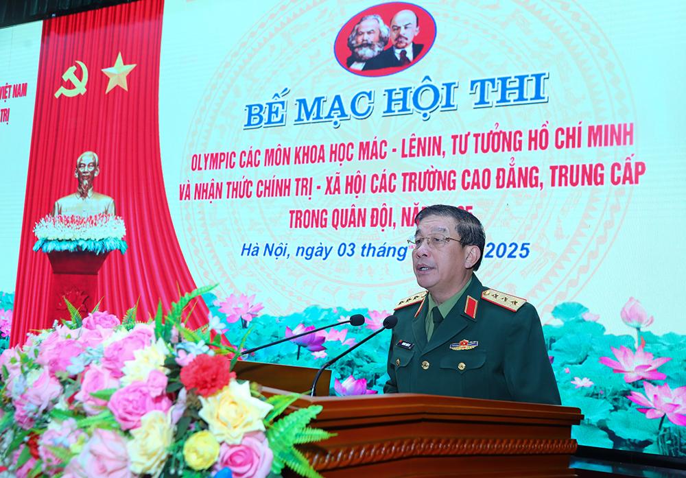 (Bqp.vn) - Chiều 3/12, tại Trường Sĩ quan Chính trị, Tổng cục Chính trị QĐND Việt Nam tổ chức Bế mạc Hội thi Olympic các môn khoa học Mác - Lênin, tư tưởng Hồ Chí Minh và nhận thức chính trị - xã hội các trường cao đẳng, trung cấp trong Quân đội năm 2025. Thượng tướng Trương Thiên Tô, Phó Chủ nhiệm Tổng cục Chính trị QĐND Việt Nam, Trưởng Ban Chỉ đạo hội thi dự và phát biểu bế mạc.